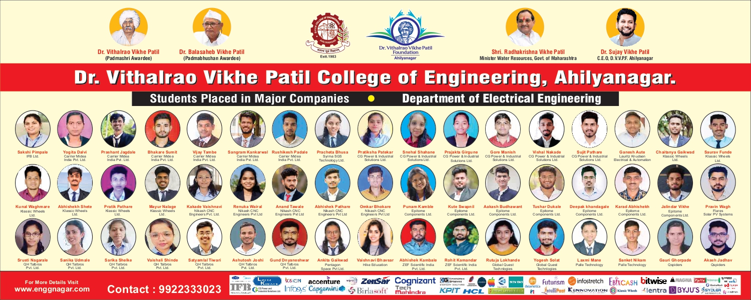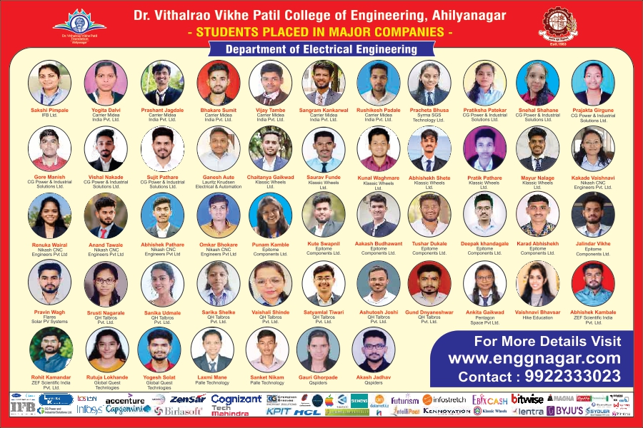 Electrical Engineering Students have ample opportunities in various field of Electrical Engineering such as Indian Engineering Services, ISRO, DRDO, NTPC, BHEL, SAIL, GAIL,IOCL, Railways, PWD, State Electricity company (Generation, Transmission & Distribution), Multinational Companies like Reliance Power, TATA Motors, L&T, Crompton Greaves, ABB, Bajaj, Havel’s, HCL, Infosys, Wipro, Tech Mahindra,TCS & many more. It is our pride more than 300 Students working in various State Electricity Companies, many students taking higher education in India & Abroad. Our Alumni Association is very strong.